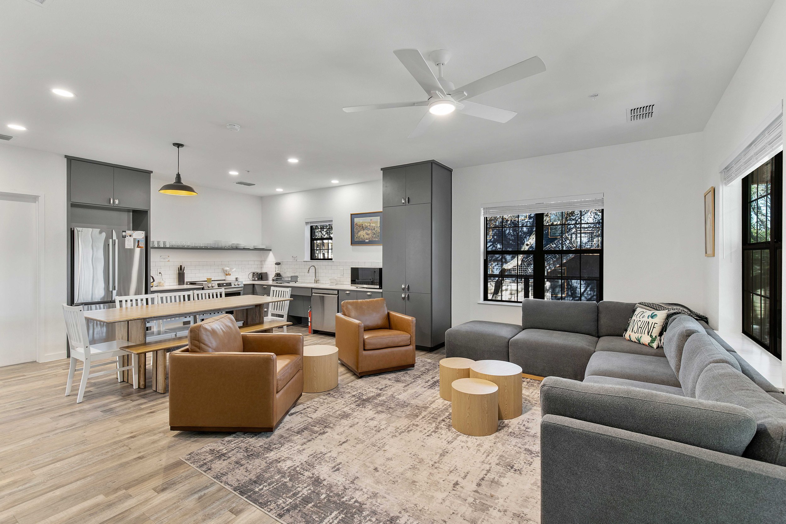 The River House is a newly built home offering a comfortable Hill Country retreat set along the banks of the Blanco River. This inviting home features private bedrooms, a full kitchen, and welcoming living spaces designed for gathering. With easy river access and beautiful views from the porch, it’s a perfect setting for peaceful mornings, outdoor adventures, and relaxed evenings. Ideal for families and larger groups, the River House combines riverside charm with convenient access to all that 7A Ranch has to offer.