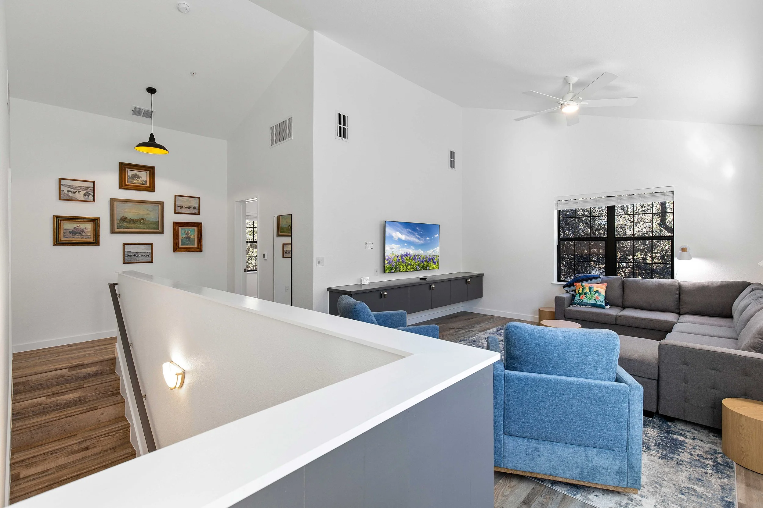 Cozy upstairs den featuring a TV + pull-out sofa
