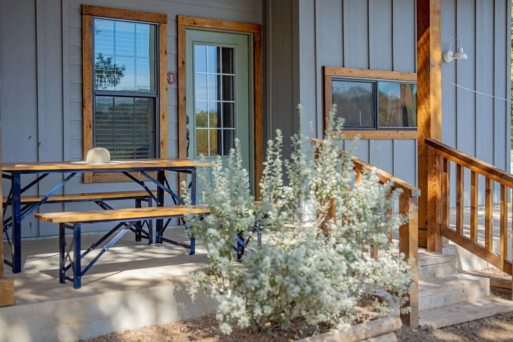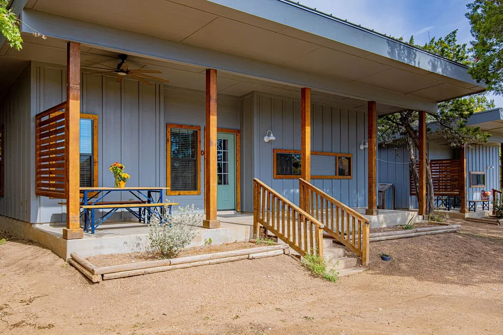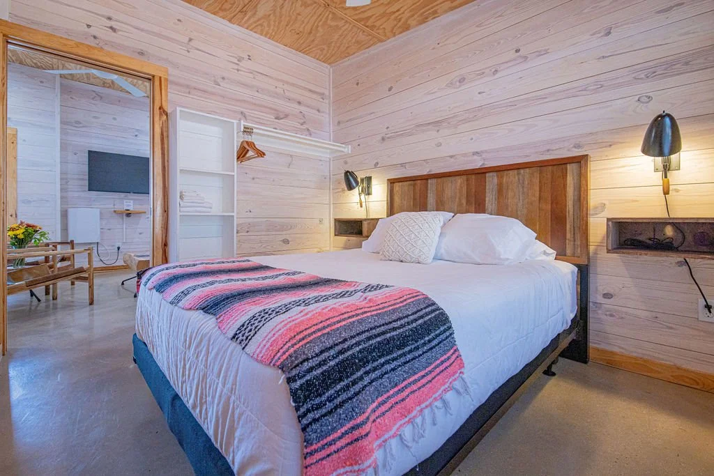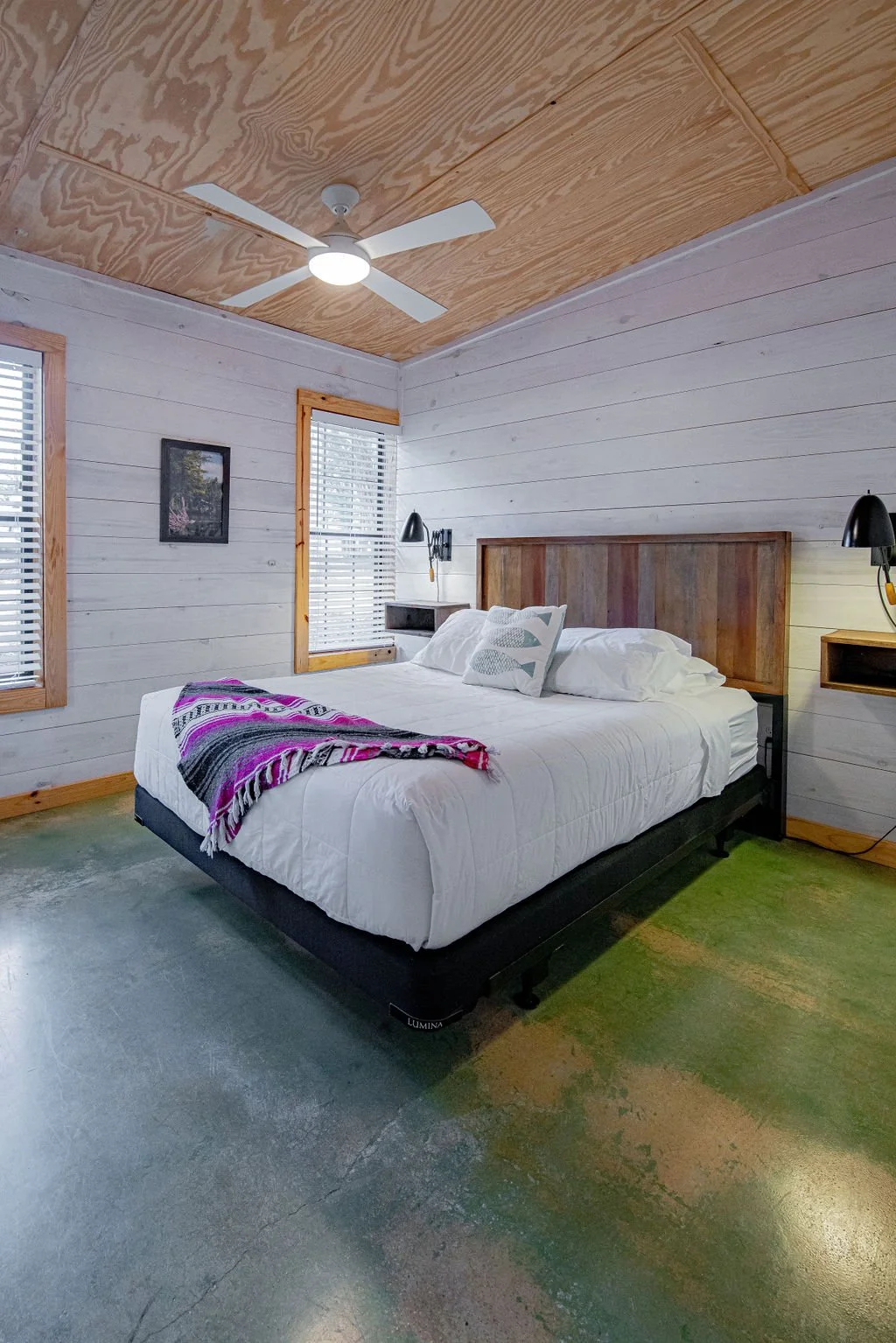 These brand new cabins were built in 2016 and offer all the modern amenities, with a touch of style - central AC, cable TV and kitchens. Our Cantina Cabins offer private bedrooms, water closets with showers separate from the bathroom sink and vanity, a cozy living area, are a short distance from the pool and offer expansive views of the spring fed Blanco River.